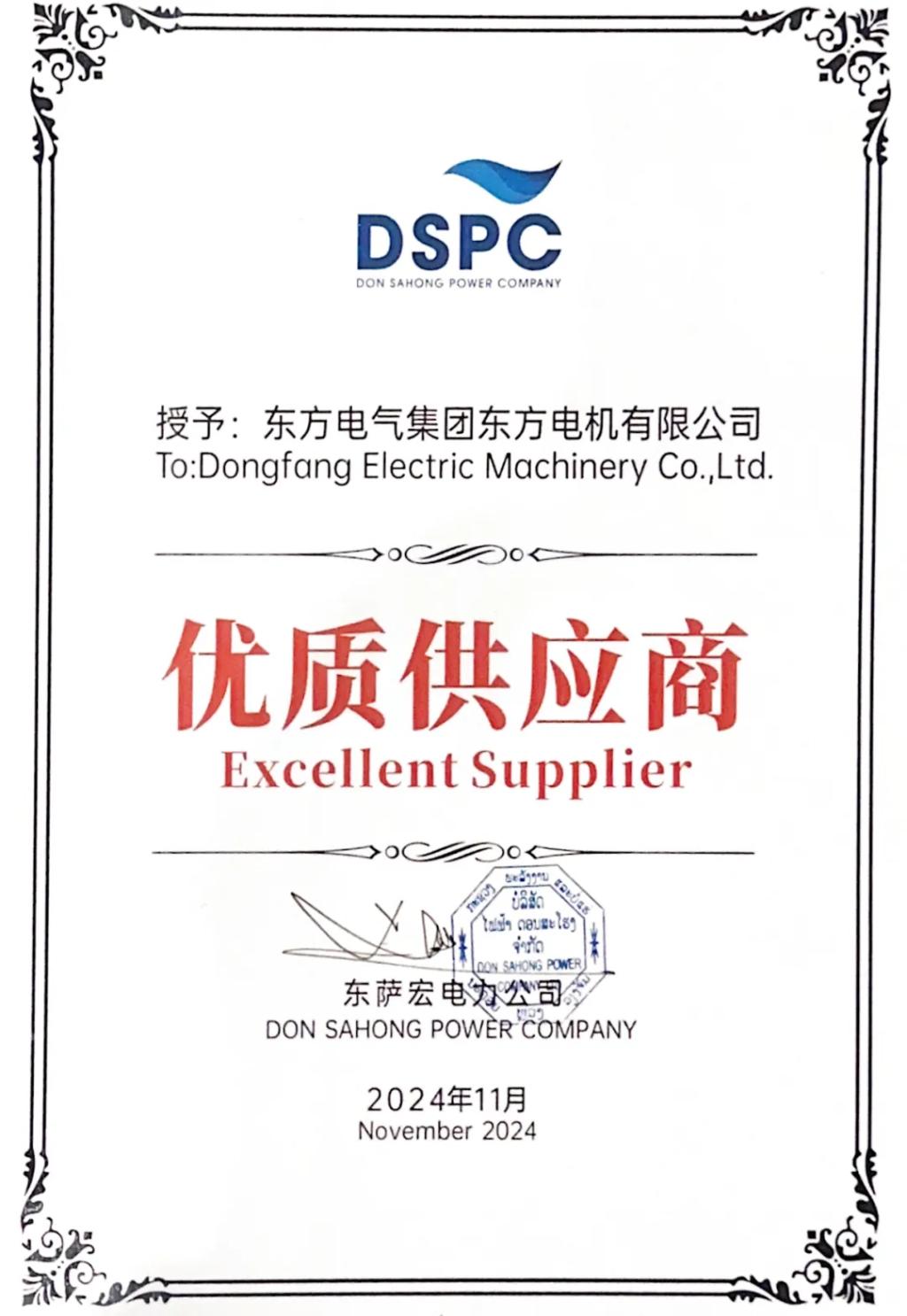 东萨宏电力公司向东方电机宣布的“优质供应商”证书,是对机组运行优异的最好证明。