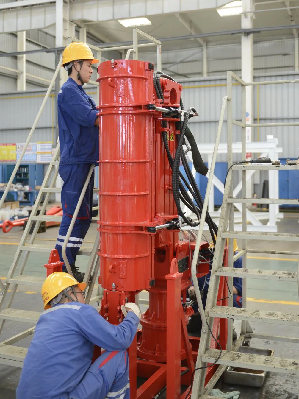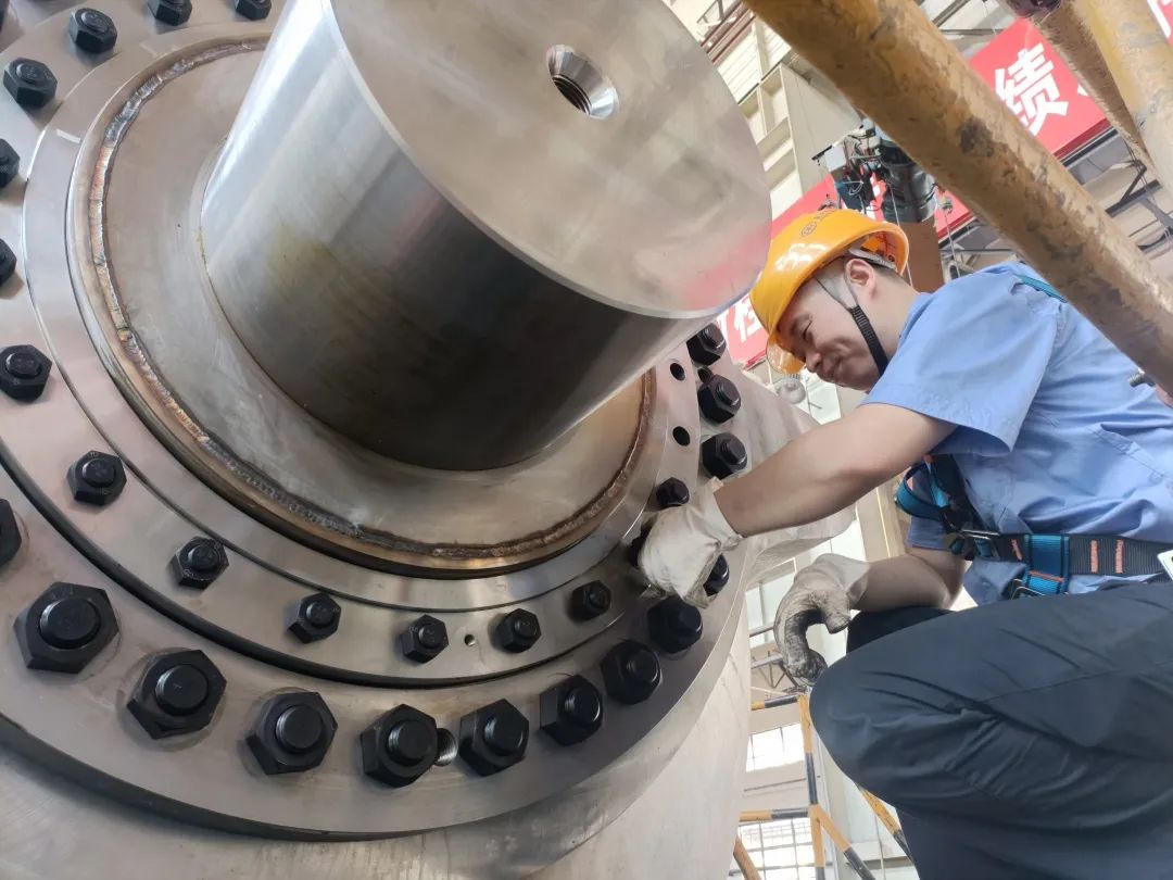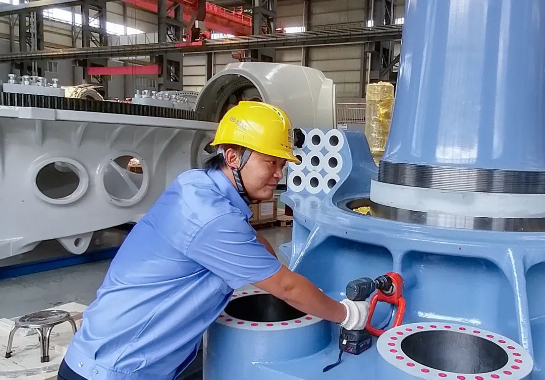 ◆东方电机水轮机分厂内,蟠龙3号机球阀轴规则在进行装配作业