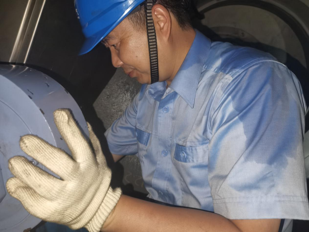◆东方重机生产制造部职工正在焊接重大项目产品人孔密封面