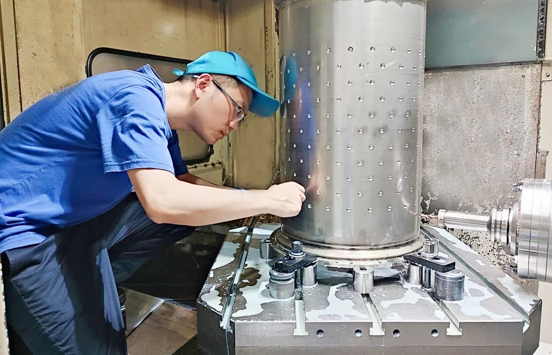 ◆东方汽轮机金工分厂职工正在对G50德阳项目燃烧器内筒进行铣削加工